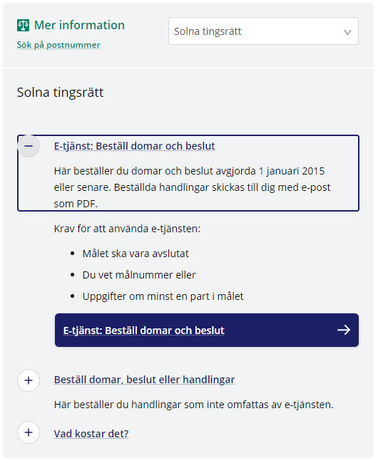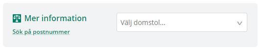 1. Välj en domstol. Vet du inte vilken domstol målet gäller så kan du söka med postnummer istället.
