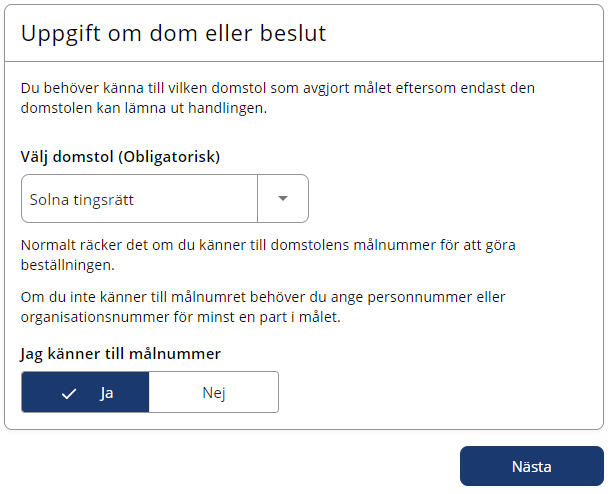 3. Nu öppnas en ny flik, om "välj domstol" inte är ifyllt så välj domstolen igen. Om du känner till målnumret, klicka Ja annars klicka Nej.