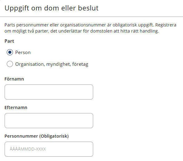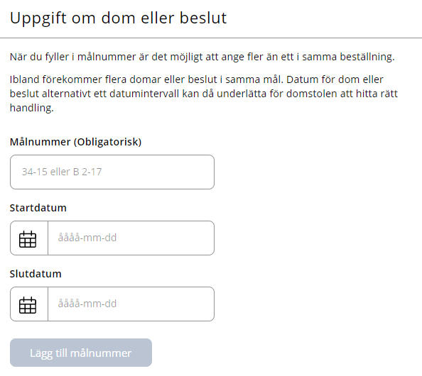 För att beställa domar behöver du:- Ett personnummer (970821-4353) eller målnummer (B/T/Ä 123-45)