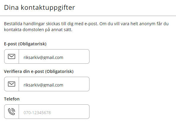 5. Fyll i mejladressen som domarna ska skickas till. Kom ihåg att all e-post som skickas till domstolarna blir offentliga och vem som helst kan begära att få läsa dessa, så om du inte vill att folk ska veta vad du beställt kan du göra en ny mejladress.