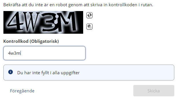 7. Skriv det som står i skummisrutan i textfältet under, den är inte case-sensitive. Tryck sedan utanför textrutan och klicka på skicka! Är det en vardag kl 13 är det möjligt att du får handlingarna inom ett par minuter, däremot kan du behöva vänta tills nästa arbetsdag om du beställer senare på kvällen.